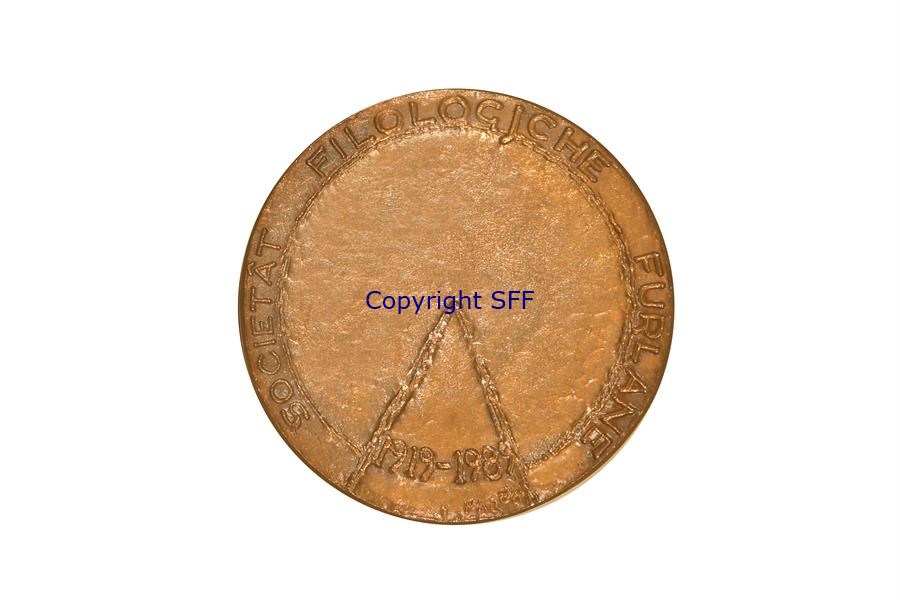 La medaglia fu realizzata dal noto orafo udinese Sergio Mazzola nel 1989 per il 70° Anniversario della Società Filologa Friulana. L'opera fu commissionata dalla Filologica in occasione del 66° Congresso annuale svolto significativamente a Gorizia, dove nel 1919 fu fondata la pregevole istituzione culturale. Mazzola per rendere ancor più celebrativa la medaglia sceglie di riprodurre sul recto il sigillo medievale concesso nel 1307 alla città da Enrico II, Conte di Gorizia, che sigla il passaggio del borgo di Gorizia a rango di città. Il sigillo rappresenta la prima raffigurazione del castello cittadino. Elimina dalla riproduzione l'iscrizione dell'ingiro. Mentre sul verso della medaglia utilizza il segno geometrico di un triangolo per incorniciare le date e riporta nell'ingiro la denominazione dell'Ente.