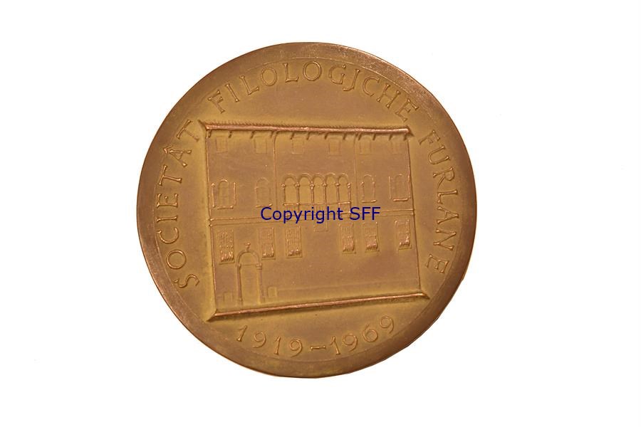 nel c.: aquila araldica contornata dagli stemmi di città storicamente importanti del Friuli e stemma dalla regione; in basso un libro aperto con riportati alcuni versi; ai lati del dorso due iniziali.