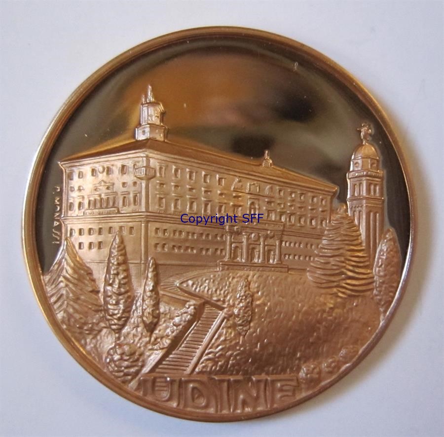 Nel dritto la veduta del colle del Castello occupa l'intero campo in basso, mentre la parte superiore è lasciata libera e trattat liscia e lucida a simboleggiare un cielo sereno.