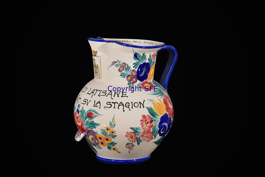 Boccale in terraglia di grandi dimensioni formato da corpo globulare con larga tesa espansa e versatoio a pizzico. In basso fascetta per il trasporto. Sul collo sotto il versatoio lo stemma comunale di Latisana e decorazione floreale policroma. All'interno della tesa iscrizione commemorativa dell'evento, mentre sul corpo il brano di una villotta friulana e in basso decorazione floreale policroma. Base, orlo e manico marcati in blu.. fiori, iscrizioni e stemma comunale