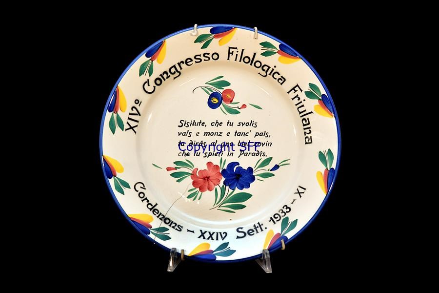 La raccolta di ceramiche Galvani, rinomata e longeva manifattura pordenonese, di proprietà della Filologica si compone di cinque piatti e un boccale di notevoli dimensioni. Gli oggetti hanno tutti un carattere celebrativo e sono prodotti realizzati in occasione di eventi specifici e significativi per il sodalizio culturale. In particolare vi sono quattro piatti realizzati per il Congresso della Filologica del 1933, svoltosi a Cordenons, il boccale per il Congresso del 1934 a Latisana e due piatti per il Congresso del 1963 nuovamente a Cordenons. Non è un caso che per l’Assemblea dei soci del ’33 la raccolta conservi un numero così alto di oggetti artistici. In quell’occasione infatti i signori Galvani, terminata l’Assemblea, avevano guidato i soci a una visita nel proprio giardino e nella fabbrica, servendo quindi il pranzo nelle sale del Dopolavoro ed omaggiando i presenti di un piatto dipinto a mano recante le parole di una villotta friulana.